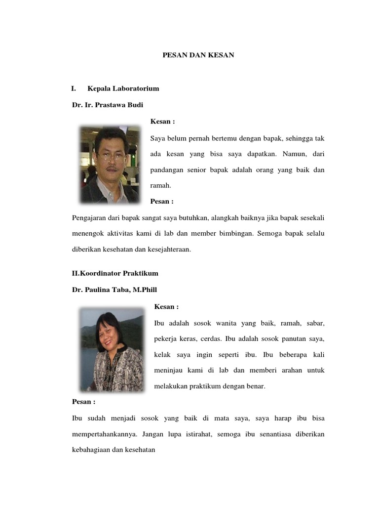 Memberikan saran seperti ini tentu akan diterima dengan baik oleh dosen sebagai bahan untuk memperbaiki cara pengajarannya di kemudian hari. Saya sangat senang bisa bersekolah di NAMA SEKOLAHNAMA KAMPUS. Kesan dan pesan terhadap dosen pengajar PERFECT itulah kesan saya terhadap dosen yang satu ini dia bernama.